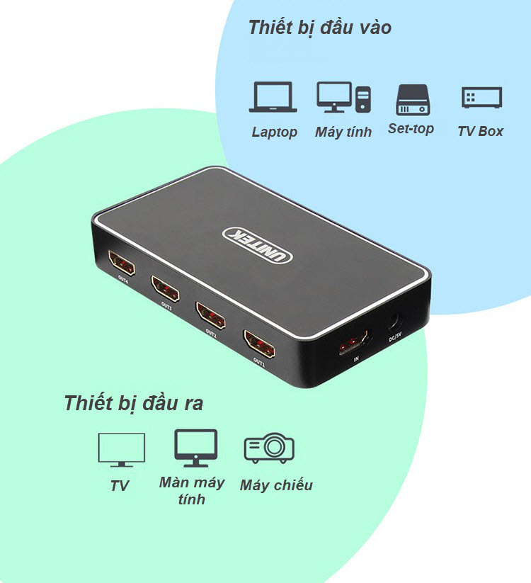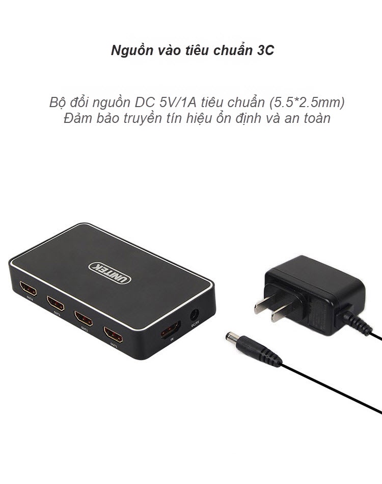 Unitek V109A - Bộ Chia HDMI 1 ra 4 Độ Phân Giải 4K HD Hỗ Trợ 3D Khoảng Cách Truyền Lên Tới 30m Kèm Nguồn AnZ Chuẩn HDM 1.4 Hỗ trợ độ phân giải lên tới 4K Khoảng cách truyền lên tới 30m (đối với cáp chính hãng) Hỗ trợ các thiết bị đầu vào: Notebook, Set-top Box, TV Box, DVD Các thiết bị đầu ra: TV, Máy chiếu, Màn hình máy tính Kèm nguồn 5v 1A