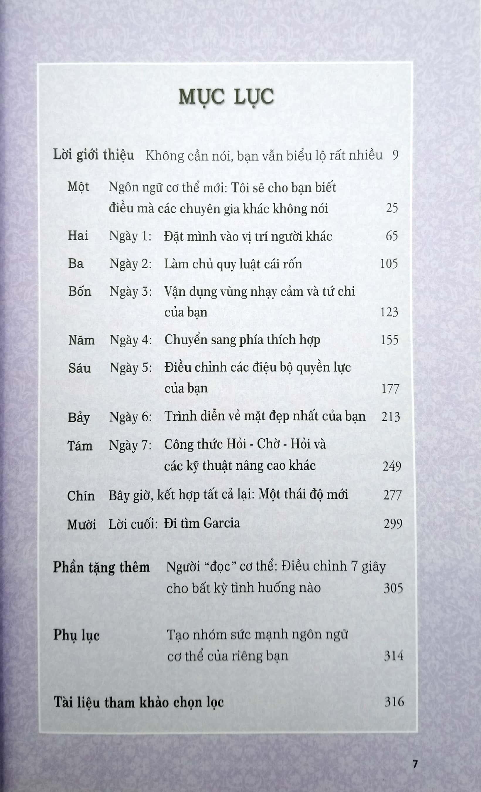 Kế hoạch 7 ngày và giải pháp 7 giây của Janine Driver chỉ cho bạn rất nhiều cách để điều chỉnh ngôn ngữ cơ thể nhằm biến bất kỳ tình huống bất lợi nào thành có lợi cho bạn. Cô sẽ tiết lộ những phương pháp mà các chuyên gia khác không muốn chia sẻ và vạch trần những điều hoang đường rất thường gặp mà họ cứ nhất quyết khẳng định là đúng: