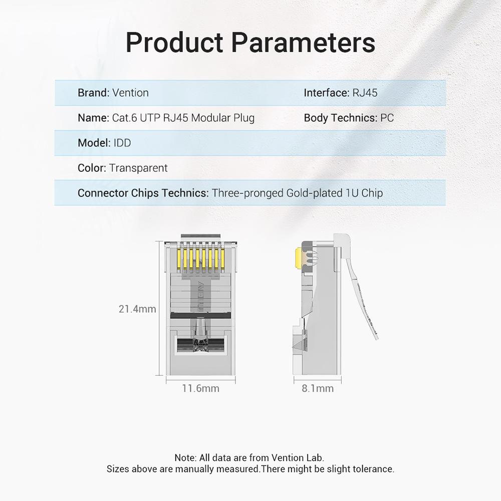 Features: Three-pronged chip, the contacts are tightly combined with the core. Gold-plated contacts, do not rust and the network speed is still stable for a long time. Metal shield shell for more stable transmission, anti-interference. High-speed network, smoother game/stable streaming/faster download. High-quality PC material, corrosion resistant and strong toughness. Widely compatible with RJ45 network cable interface equipment. Specification: Brand: Vention Name: Cat.6 UTP RJ45 Modular Plug Model: IDD Color: Transparent Interface: RJ45 Body Technics: PC Shield Shell: Nickel-plated Iron Shell Connector Chips Technics: Three-pronged Gold-plated 1U Chip Item size:21.411.68.1 mm /0.840.460.32 in(L W H) Packing list: 50 * Cat.6 UTP RJ45 Modular Plug