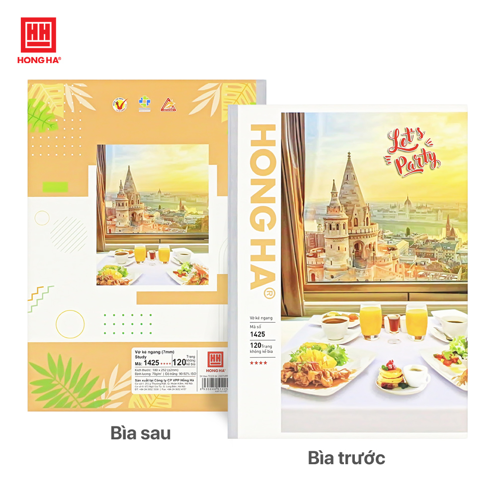 Vở kẻ ngang 120 trang Hồng Hà Let's Party 1425 được lấy cảm hứng từ bữa tiệc dã ngoại vui vẻ tạo ra bộ sản phẩm "Let's Party" nhiều màu sắc và phù hợp với xu hướng. Bề mặt giấy trơn mịn, công nghệ mới gáy vuông, vào keo lạnh, dán gáy được đóng chắc chắn. Ruột vở in dòng kẻ đậm nét giúp việc ghi chép dễ dàng. 1. THÔNG SỐ KỸ THUẬT