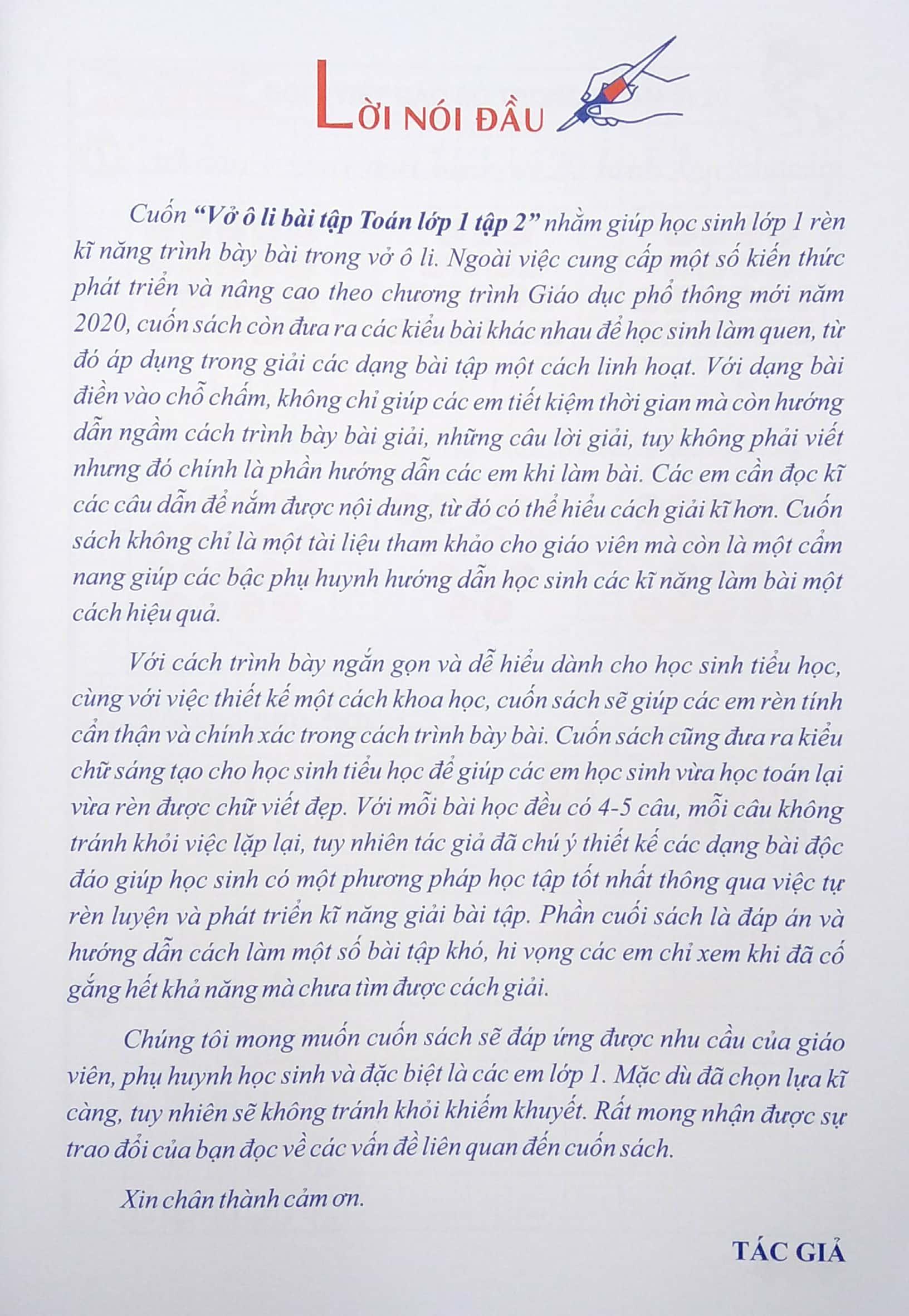 Cuốn “Vở ô li bài tập Toán lớp 1 tập 2” nhằm giúp học sinh lớp 1 rèn kĩ năng trình bày bài trong vở ô li. Ngoài việc cung cấp một số kiến thức phát triển và nâng cao theo chương trình Giáo dục phổ thông mới năm 2020, cuốn sách còn đưa ra các kiểu bài khác nhau để học sinh làm quen, từ đó áp dụng trong giải các dạng bài tập một cách linh hoạt.