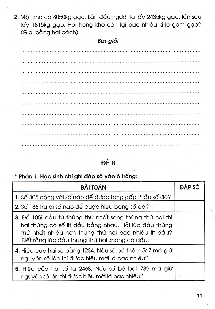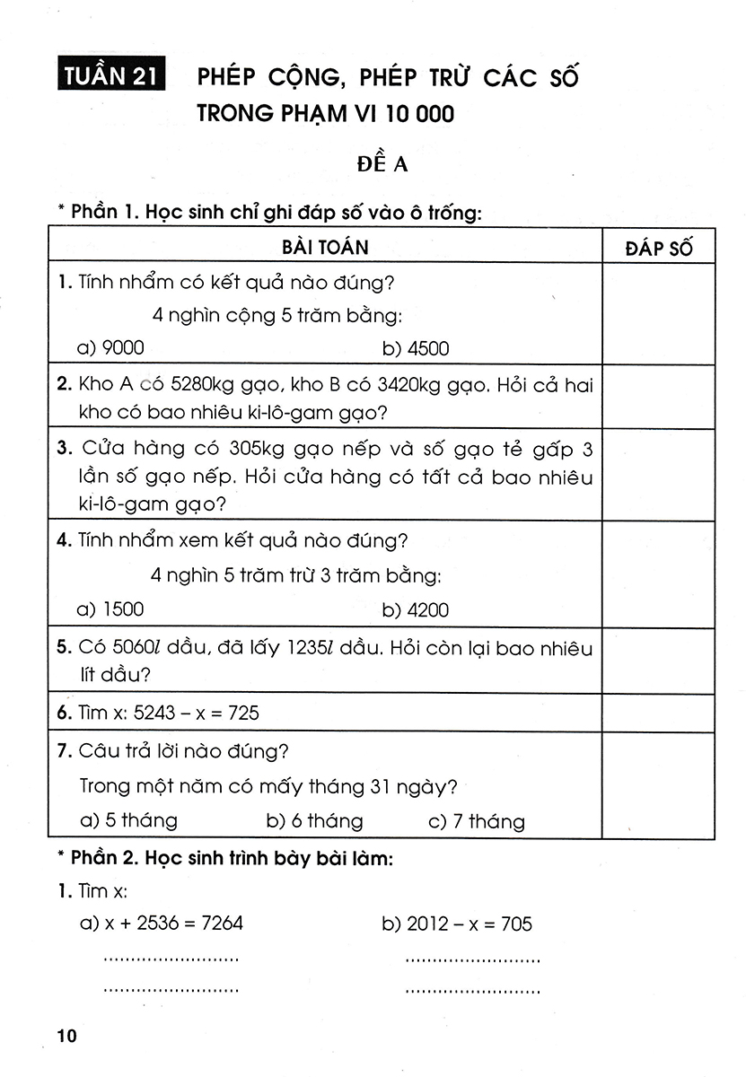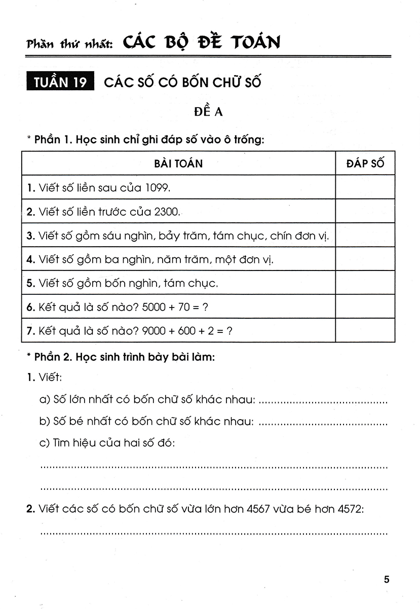 lễ gồm hai bộ đề A và B; đề A gồm những bài tập chọn lọc trong tuần và đề B gồm những bài tập phát triển, nâng cao. Đồng thời còn có bộ để ôn tập cuối năm nhằm chuẩn bị cho học sinh học Toán lớp 4, Về nội dung, tập 2 có những chủ đề sau:
