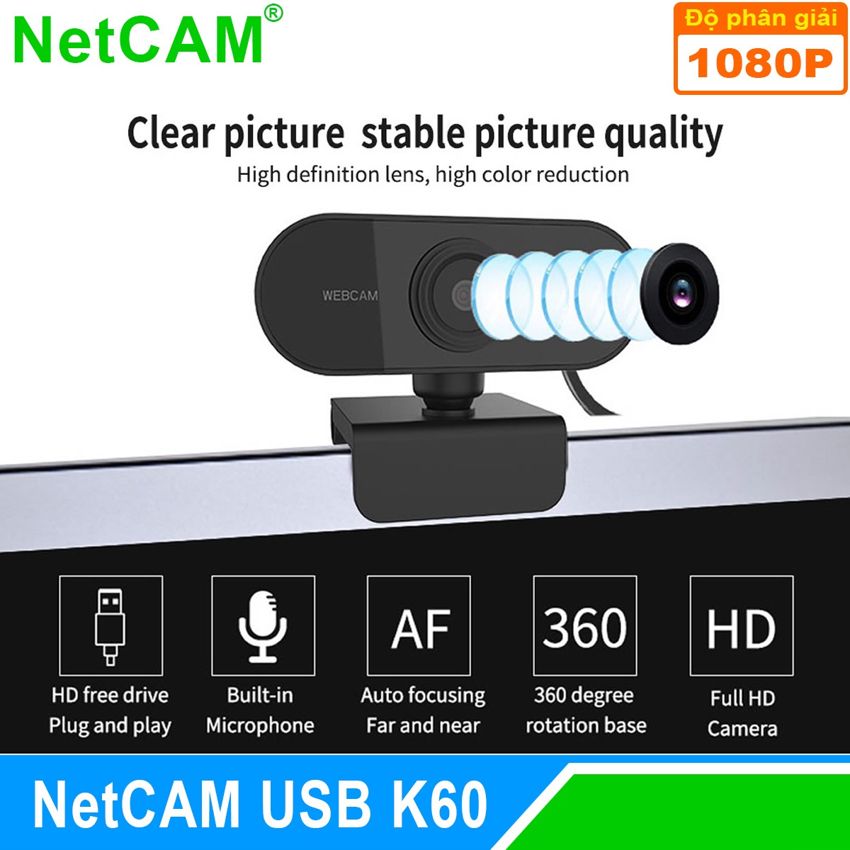 Webcam NetCAM USB K60 độ phân giải 1080P ️ Webcam NetCAM USB K60 được thiết kế nhỏ gọn, hiện đại với màu đen cá tính và thanh lịch, dễ sử dụng ở mọi vị trí.
