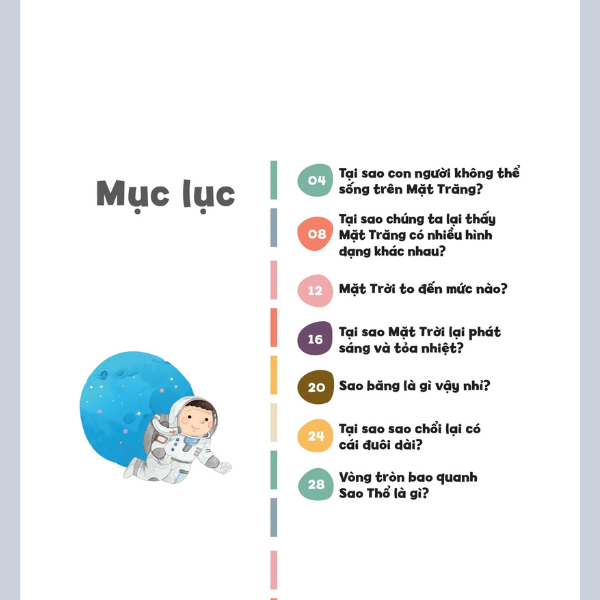 • Thám hiểm vũ trụ: Tại sao con người không thể sống trên mặt Trăng, Sao Băng là gì, Tại sao Sao Hỏa có màu đỏ, Trong vũ trụ có rác không?...