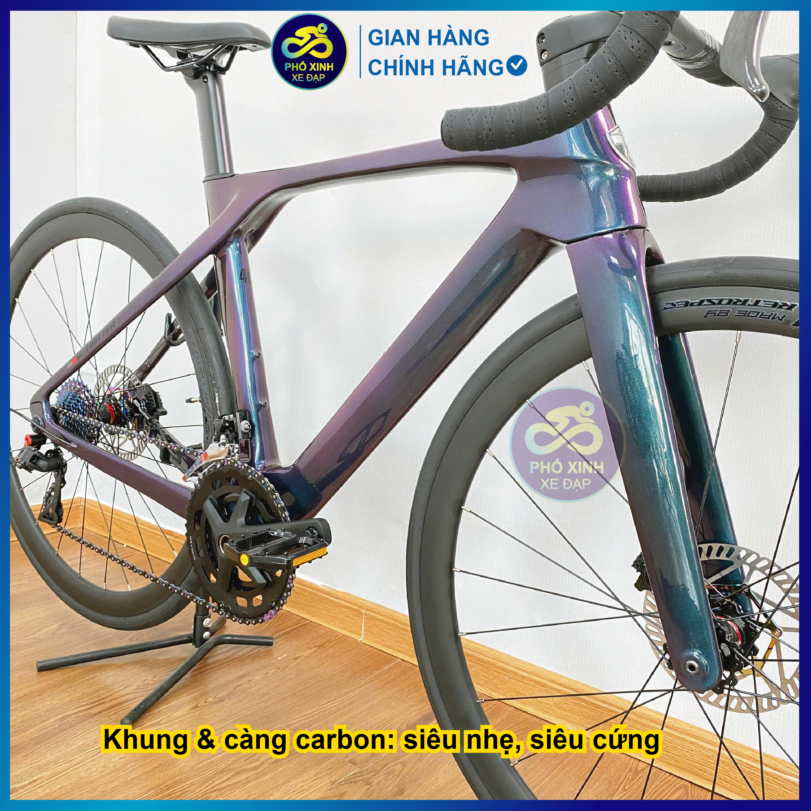 Khung & càng carbon: siêu nhẹ, siêu cứng, hấp thụ rung động tốt.