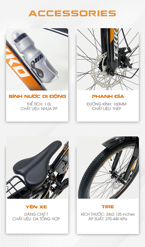 Thông số chi tiết Khung sườn: Khung hợp kim thép Bánh xe: Lốp 24 inch Vành xe: Hợp kim nhôm Truyền động: - Tay đề 21 tốc độ - Đĩa: 3 tầng 42-34-24T - Líp: 7 tấng 14-32T Phụ tùng: - Phanh đĩa - Đùi hợp kim - Yên bọc da mềm - Phuộc có nhún - Bàn đạp nhựa