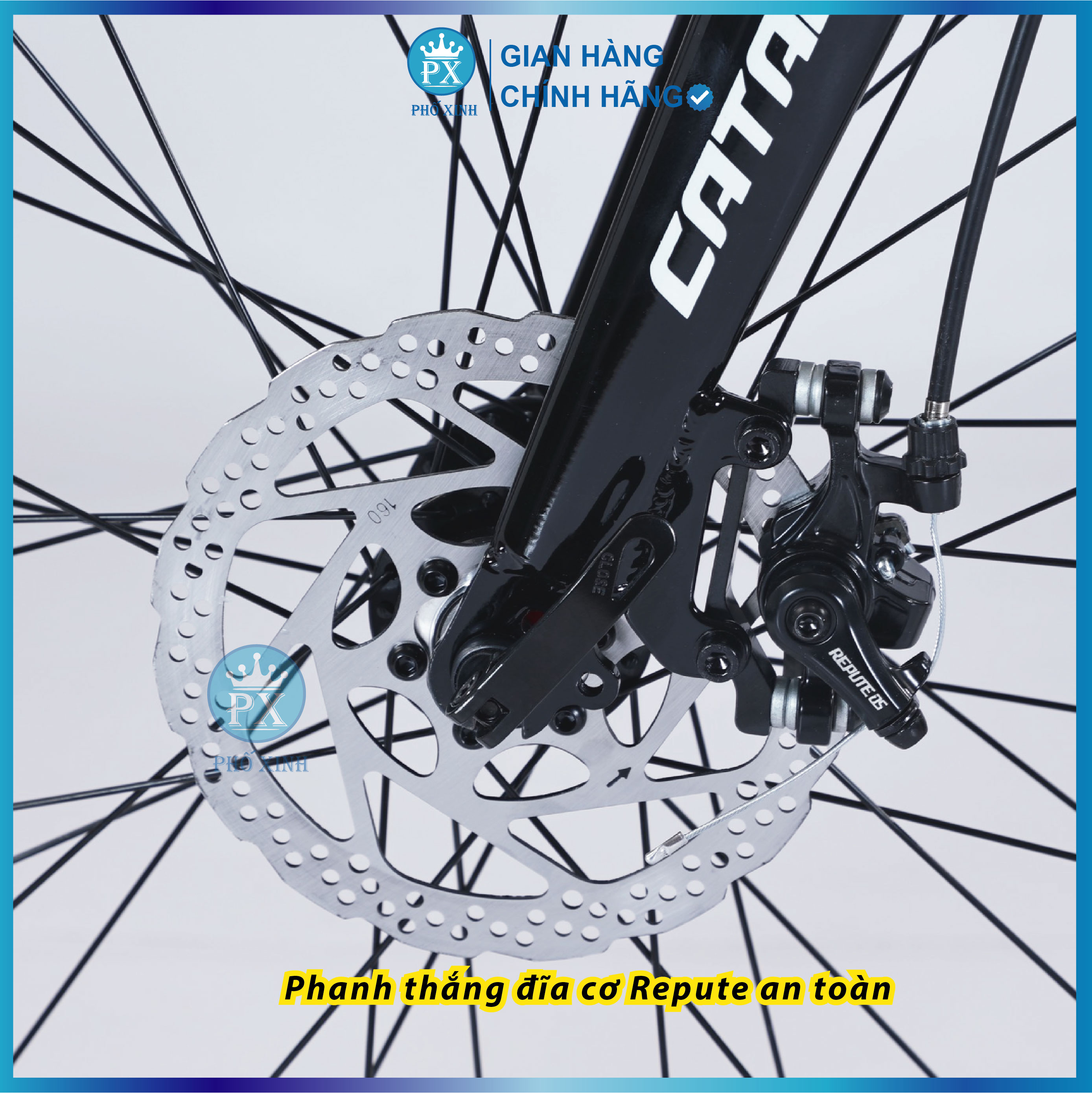 Ghi đông CATANI được uốn công nhẹ, tạo tư tế lái thoải mái nhất. Các chi tiết chữ nổi sử dụng công nghệ laser.Bộ truyền động S H I M A NO tourney lên đến 21 tốc độ, gồm 3 dĩa 7 líp. Cho bạn dễ dàng tăng tốc, trợ thủ đắc lực đồng hành cùng bạn. Đùi dĩa CATANI chất liệu thép hợp kim chắc chắn.Hệ thống thắng đĩa cơ, đảm bảo an toàn trên tất cả mọi nẻo đường.