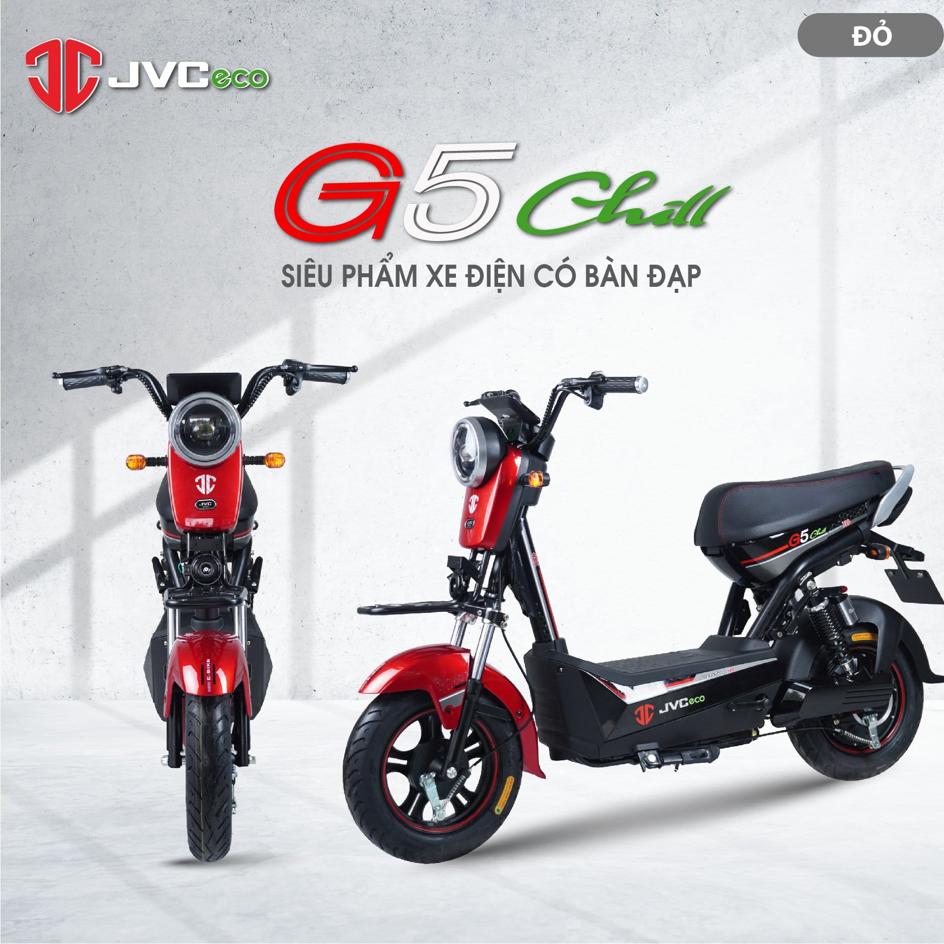JVC G5 CHILL XE ĐIỆN CÓ BÀN ĐẠP ️ JVC G5 CHILL được thiết kế theo phong cách HIỆN ĐẠI, TINH TẾ mang tới sự tự tin cho người lái ƯU ĐIỂM NỔI BẬT CỦA JVC G5 CHILL Bàn đạp trợ lực hỗ trợ hành trình di chuyển Bộ tem mới thiết kế THỜI TRANG Đèn pha dạng tròn góc sáng rộng hơn Tay ga, công tắc, tay phanh cao cấp đến từ thương hiệu Wuxing Đồng hồ dẹt hiển thị thông minh Yên xe êm ái in dấu ấn logo JVC Động cơ mới kết hợp với bộ điều khiển không dây Ắc quy được bổ sung thanh giằng bình chắc chắn tuyệt đối, tháo lắp dễ dàng hơn Vành trước nhập khẩu có thiết kế riêng biệt đồng bộ với động cơ Giam xóc sau nâng cấp chất lượng, bảo hành 12 tháng Động cơ và khung xe bảo hành 36 tháng Bình ắc quy bảo hành 18 tháng
