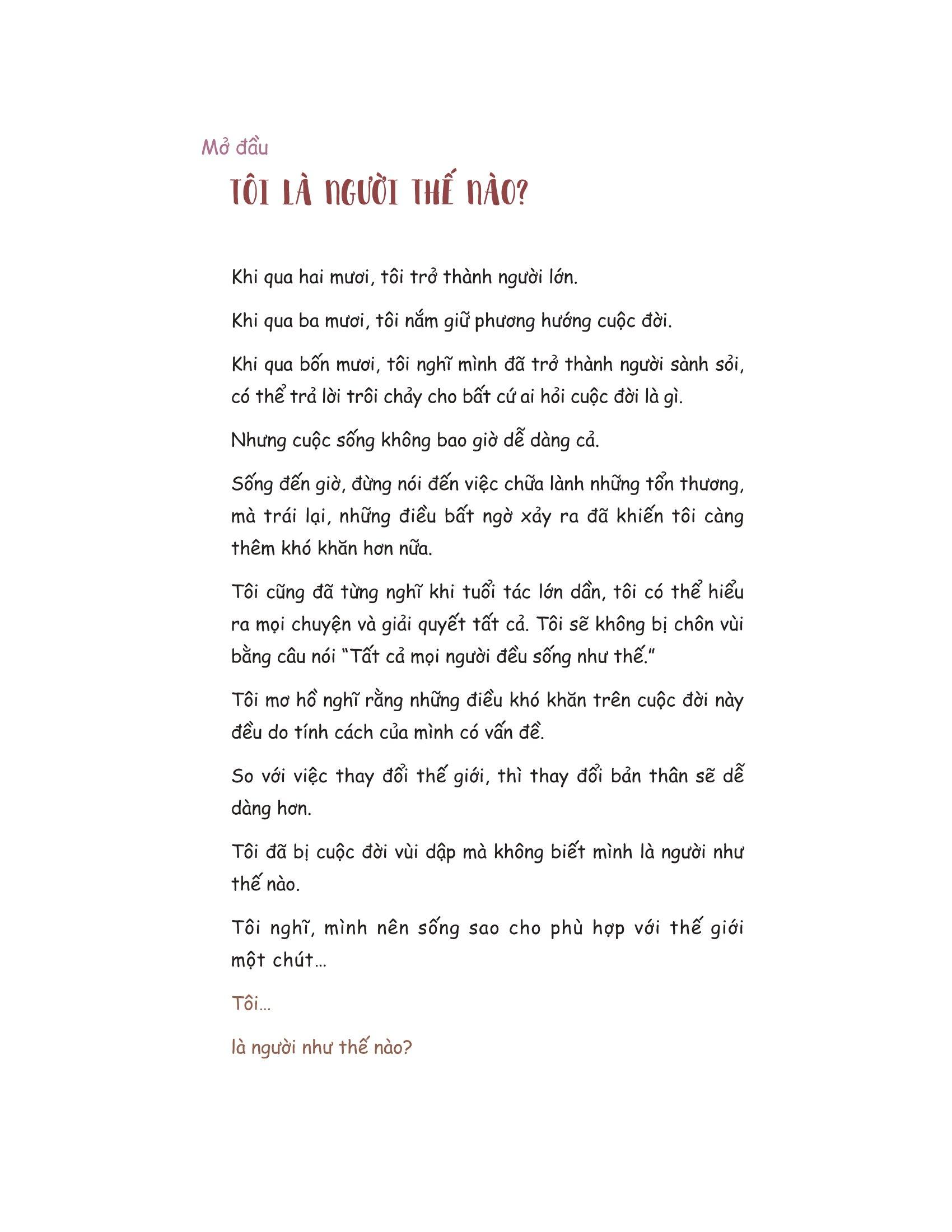 Xin Lỗi, Hôm Nay Cuộc Đời Tôi Là Trên Hết! Dù xinh đẹp hay xấu xí, bất kể tôi là người như thế nào, thì trước tiên, tôi phải chấp nhận và yêu thương bản thân m.ình. Tôi là một người rất nhạy cảm. Đôi khi nhạy cảm đến mức tự làm khó chính m.ình. Càng cố gắng quan tâm, tôi càng trở nên mệt mỏi, các mối quan hệ càng thu hẹp, và tôi không thể làm hai việc cùng một lúc. Nếu lãng phí cuộc đời để trở thành một người xuất sắc, tuyệt vời và xinh đẹp, thì đó chẳng phải là một việc rất đáng buồn sao? Tôi chỉ cần sống một cuộc đời là chính tôi thôi. Vì thế, tôi quyết định yêu bản thân m.ình. Tôi quyết định bắt đầu từ điều đó.