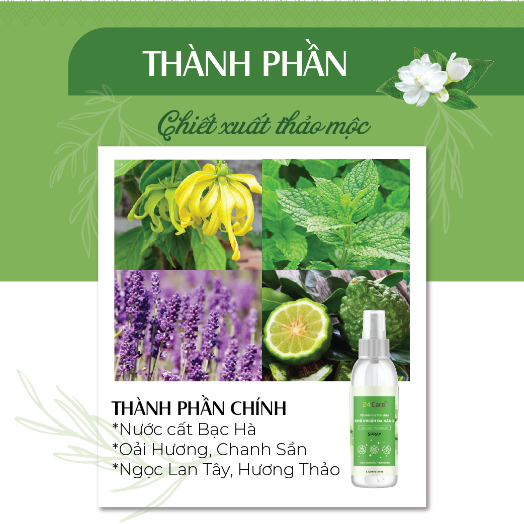 ✨Xịt khử mùi đa năng Tinh dầu 24CARE 50ml/100m/250ml - Xịt bề mặt bị dính bẩn do đồ ăn rơi rớt trên bàn ghế, sàn nhà.
