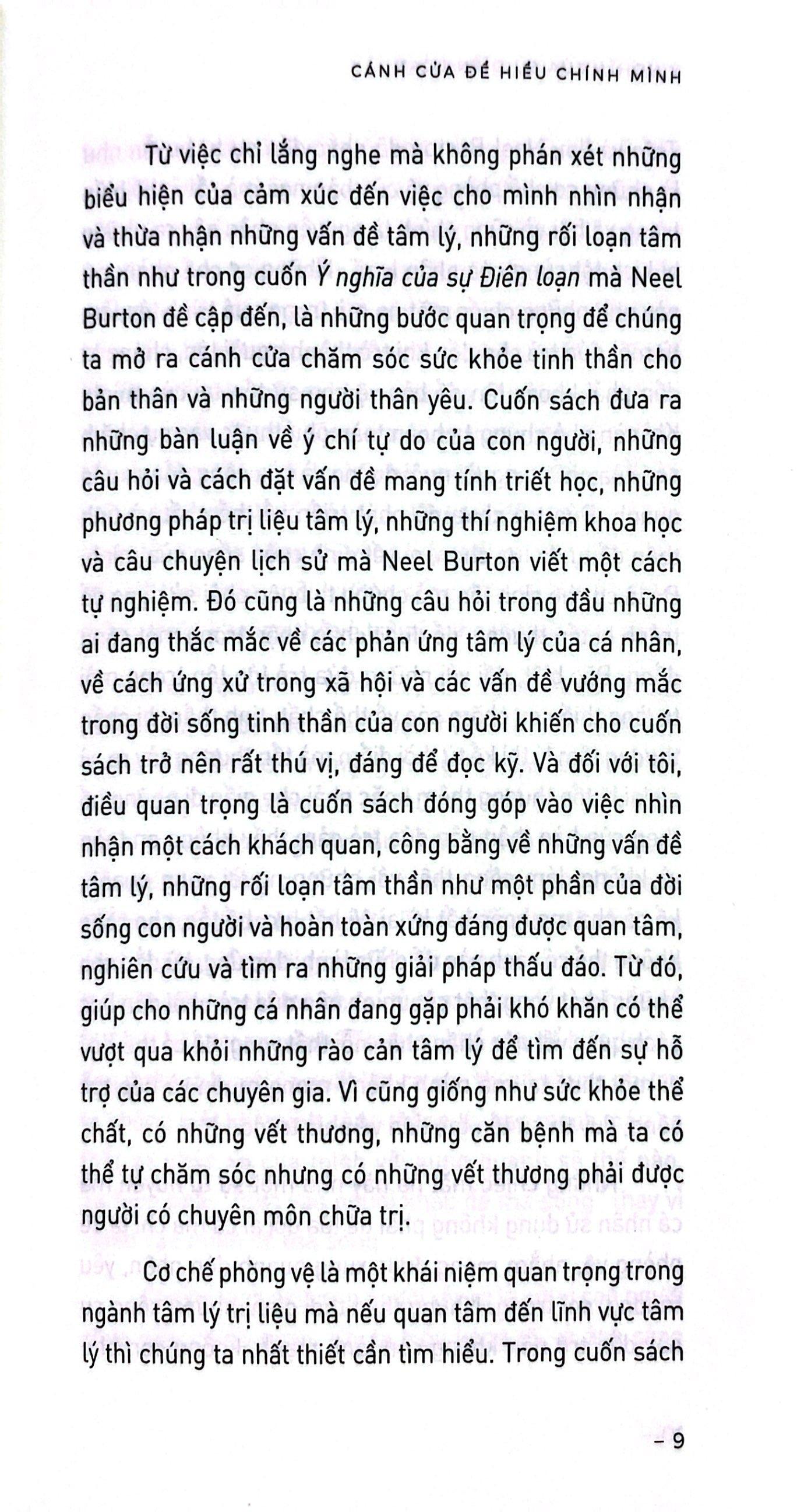 Bằng tri thức tuyệt vời và kinh nghiệm thực tế của m.ình, Neel Burton đã dẫn dắt và giúp người đọc hiểu đầy đủ về các rối loạn tâm thần theo sự phát triển từ y học nguyên thủy đến y học hiện đại, thông qua các phân tích khách quan và không thiên kiến – với lập luận và dẫn chứng cụ thể, ví dụ minh họa sinh động. Cuốn sách mang đến những góc nhìn mới khi trao đổi về các vấn đề không mới, từ đó trở nên gần gũi hơn với bạn đọc phổ thông.