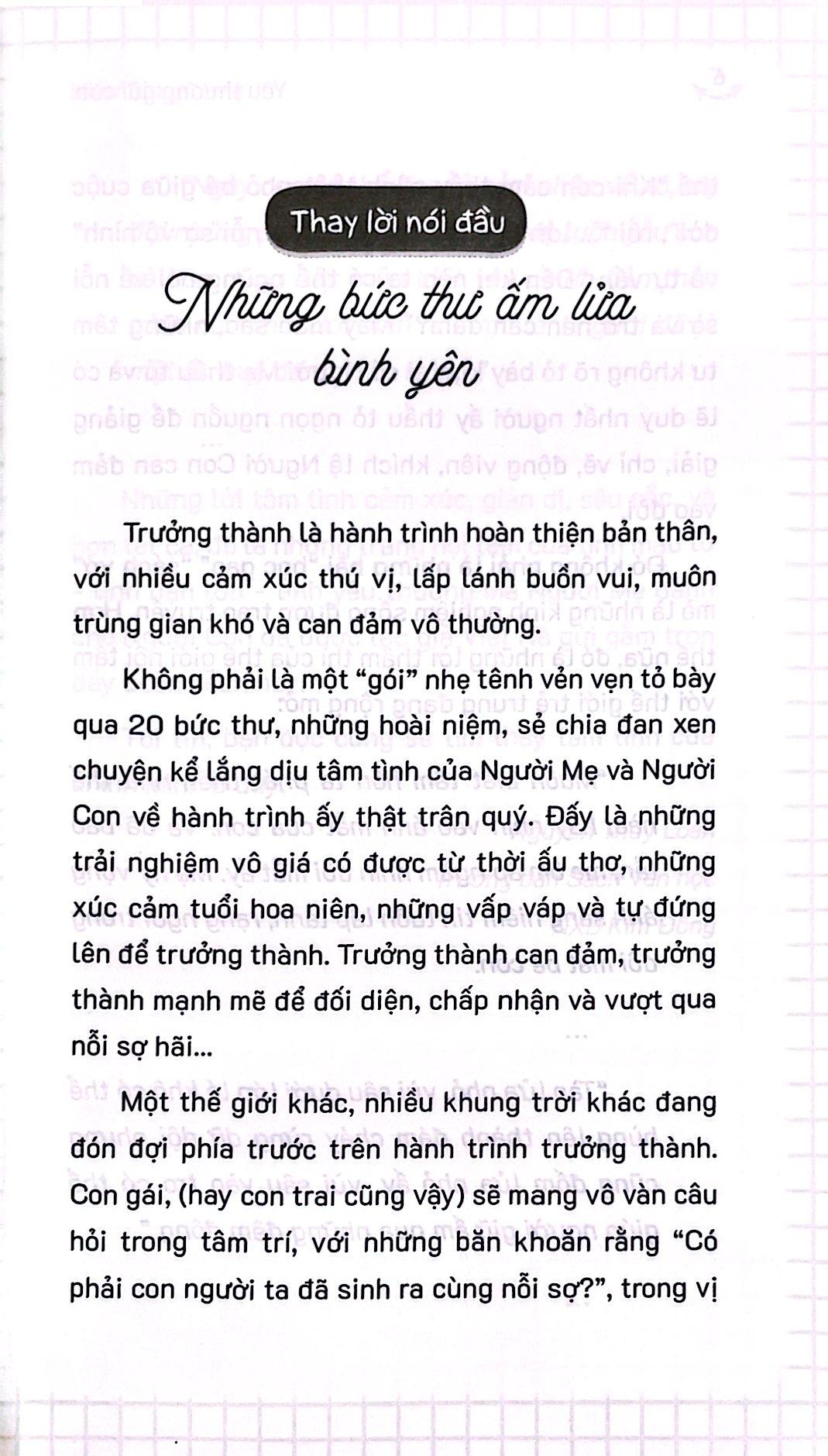Cuốn sách gồm 20 bức thư mẹ gửi cho con gái, là những câu chuyện về trăn trở, nỗ lực vượt qua sợ hãi để đi tìm sự cân bằng và niềm tin vào chính bản thân m.ình của một người phụ nữ bình thường vốn mang nhiều âu lo, sợ hãi trong cuộc đời, từ đó truyền cho con những bài học cuộc sống. Bằng cách gọi tên các nỗi sợ: Sợ m.ình không được đủ yêu thương, Sợ xa người bạn học cùng, Sợ vì m.ình quá nhút nhát, Sợ người khác không hiểu m.ình, Sợ khi người thân qua đời, Sợ khi m.ình không được như kỳ vọng… - Đó có thể là nỗi sợ hiển hiện trước mắt, cụ thể thường nhật hay những nỗi sợ vô hình, những nỗi sợ từ sự tưởng tượng, người viết nhìn lại bản thân m.ình, trò chuyện cùng con, giúp con gọi tên những nỗi sợ đó và tìm cách vượt qua nó. Không né tránh nỗi sợ, cũng không giáo điều thuyết giảng, nội dung bản thảo là những lá thư nhẹ nhàng mà người mẹ muốn con gái cùng m.ình lắng nghe và khám phá nội tâm của m.ình.